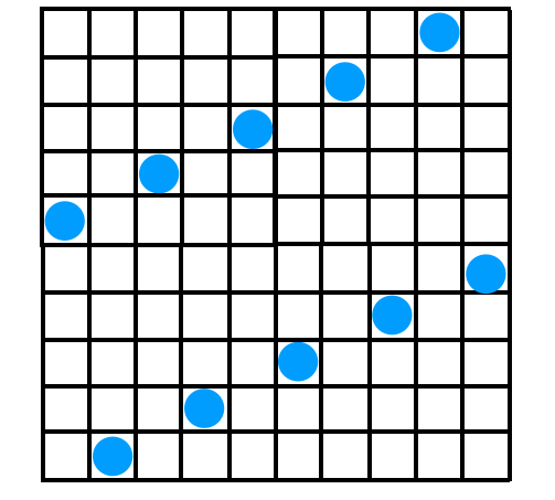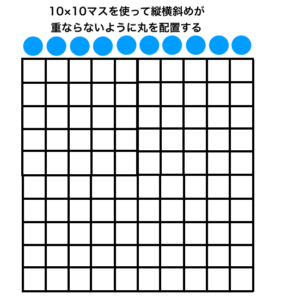- 10×10マスに10この丸を縦横斜めに並ばないように配置する