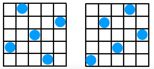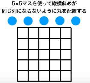 - 5×5マスに5つの丸を縦横斜めに並ばないように配置する