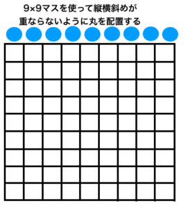 - 9×9マスに9つの丸を縦横斜めに並ばないように配置する