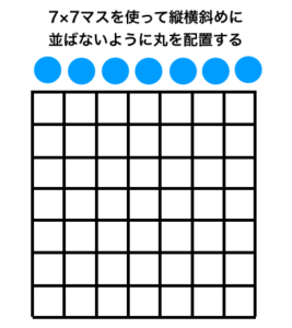 - 7×7マスに7つの丸を縦横斜めに並ばないように配置する
