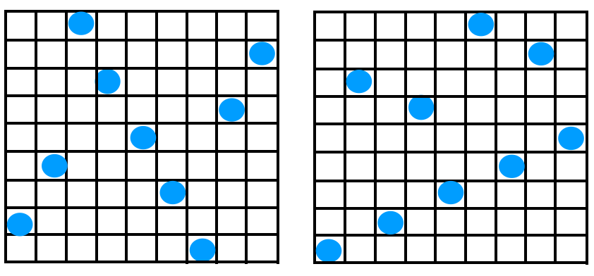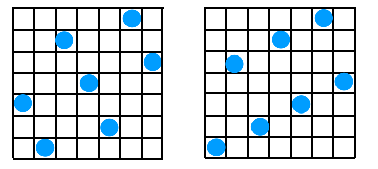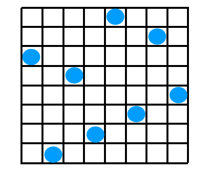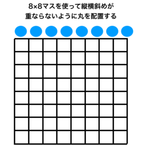 - 8×8マスに8つの丸を縦横斜めに並ばないように配置する