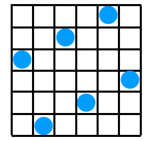 - 6×6マスに6つの丸を縦横斜めに並ばないように配置する