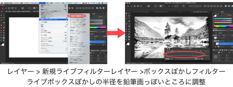 また、ボックスぼかしの他のライブフィルターレイヤー(手順5)を使う事でも鉛筆画っぽくする事ができるので、いろいろと試してみましょう。