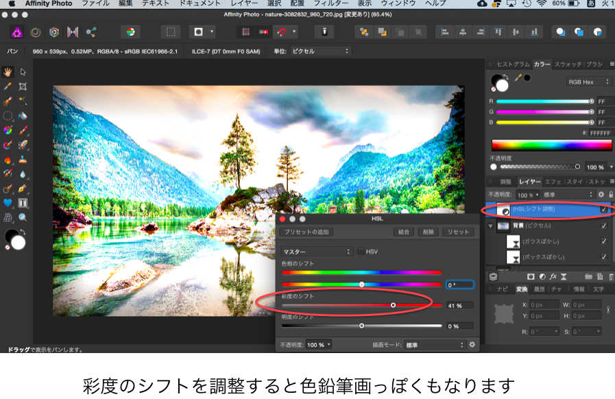 鉛筆画っぽく編集した後に、「HSL」の彩度のシフトを調整する事で、色鉛筆画っぽくすることも可能です。
