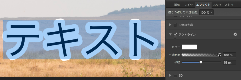 エフェクト:アウトラインが輪郭、外側の光彩が光、その他にも3Dやグラデーションなど多くのエフェクトがあります