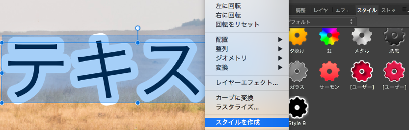 上の画像のように、テキストの上で「右クリック」>「スタイルを作成」をクリックすると画面右の「スタイル」に保存されます。