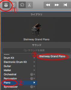 下の画像の①から③の順にクリックして音色をピアノに設定します。