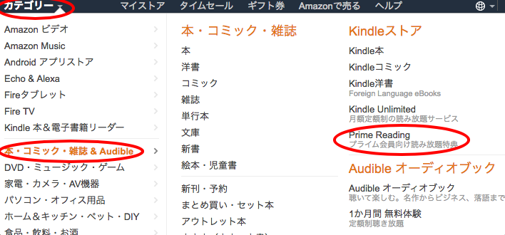 「カテゴリ」>「本・コミック・雑誌&Audible」>「Prime Reading」をクリック
