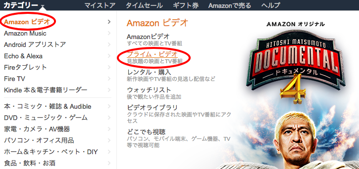 「カテゴリ」>「Amazonビデオ」>「プライム・ビデオ」をクリック。