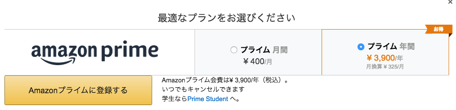 - 月額400円、年間3900円(月325円)でプライム会員登録