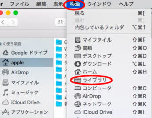 「Finder」を開いた状態で「移動」をクリックし、altキーを押すと上の画像のように「ライブラリ」が表示されます。