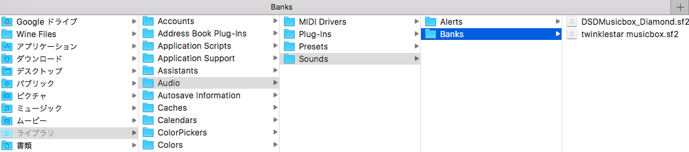 そこから「ライブラリ」>「Audio」>「Sounds」>「Banks」フォルダを開き、その中にサウンドフォントファイルを入れておきます。
