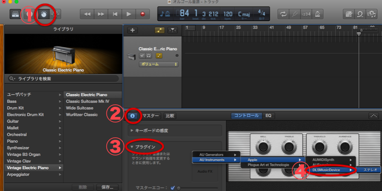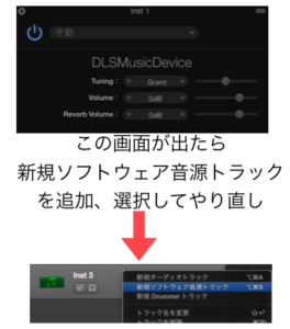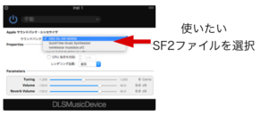 上の画像のように、ソフトウェア音源を選択した状態で、「プラグイン」から「AU Instruments」>「Apple」>「DLSMusicDevice」をクリックします。