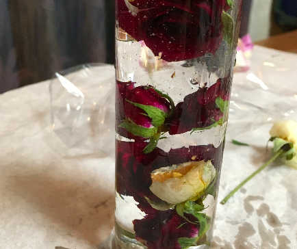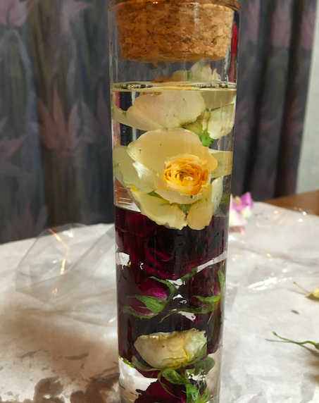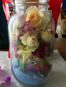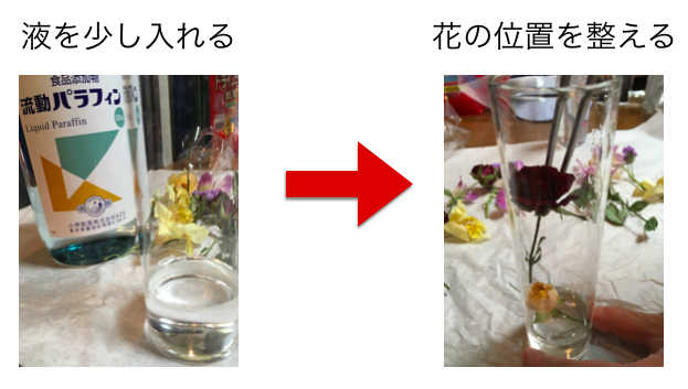 花を液に入れると花が浮かび上がってきてしまうので、花に気泡が付かないように入れ、容器の幅いっぱいになるように詰め込むか、ふさふさとした「かすみ草」などを入れてから花を散りばめるのが綺麗に入れるコツです。