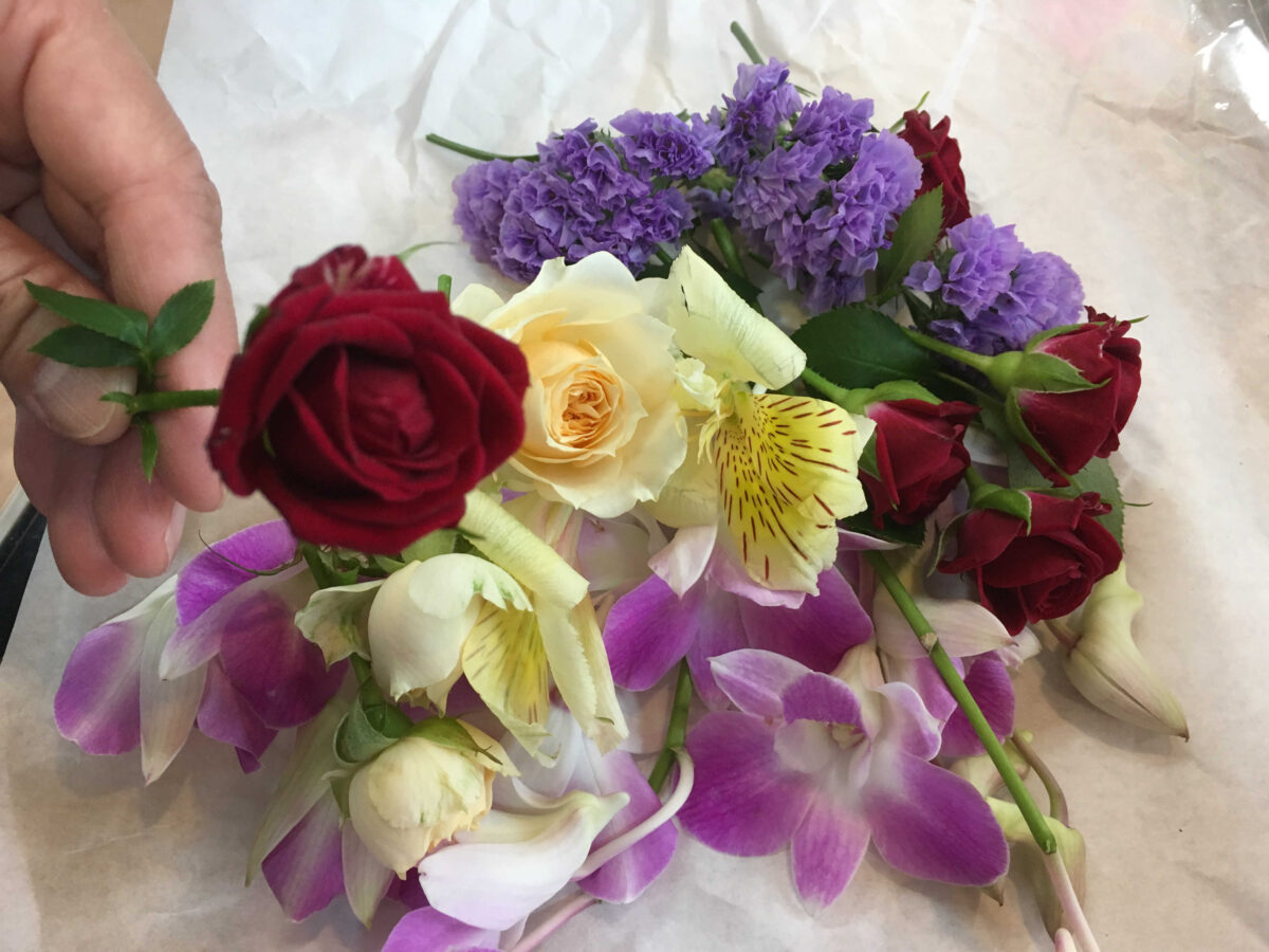 - 花が浮き上がってこないように「かすみ草」など、ふさふさとしたものを入れる