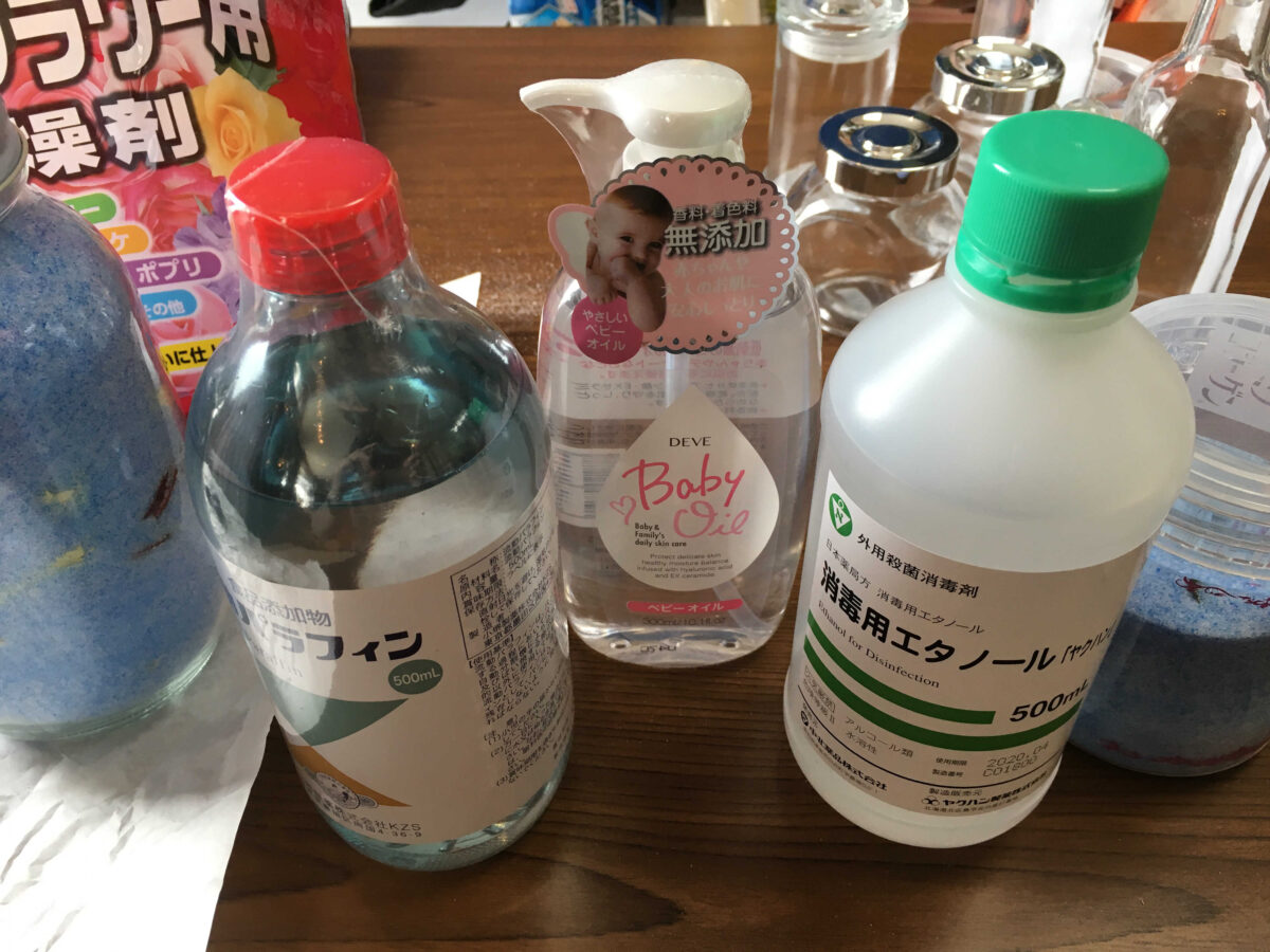 専用のシリコンオイルはハーバリウムを作る際に一番難しいポイントである、「花が浮かび上がってくる」のを防ぐため、できるだけ比重の軽いオイルが使われています。