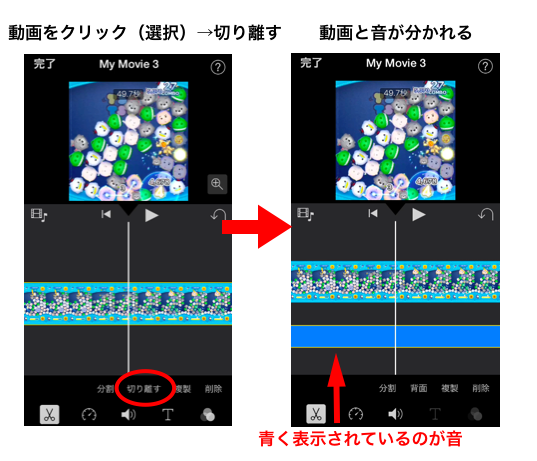 1. 音を選択した状態で「分割」すると、白い線(再生すると動く線)の位置で分割されます