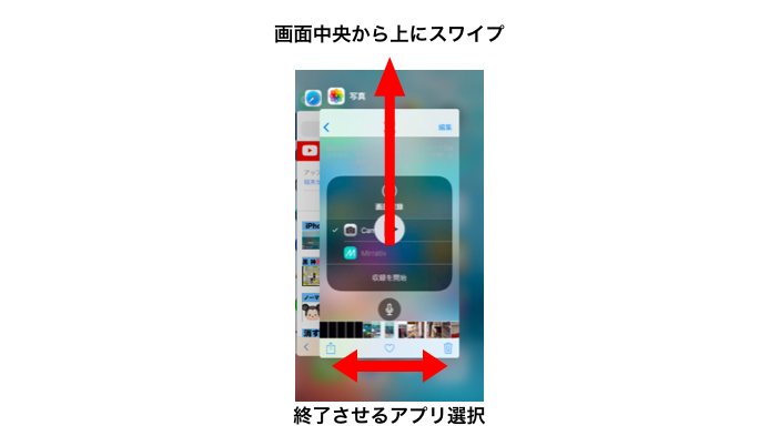 2. 起動しているアプリ一覧の画面が表示されるので、左右にスワイプして終了させるアプリ画面を選択し、画面中央から上へ向かってスワイプする