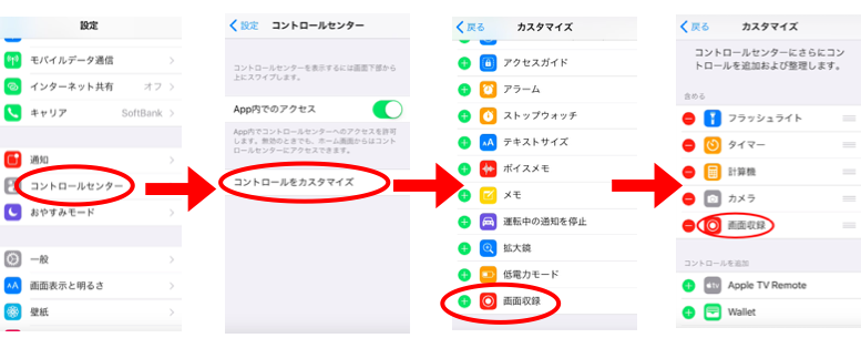 のページにある「画面収録」をタッチして、コントローラーの中に含めるようにしましょう。(「画面収録」が上の画像一番右の位置になったら設定完了)