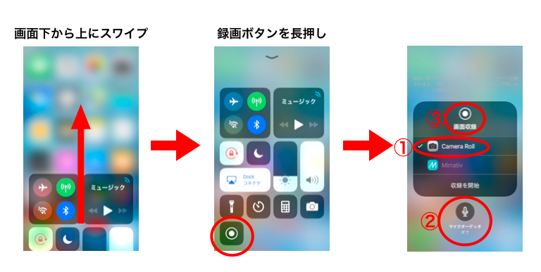 4. ②マイクオーディオ「on/off」を切り替える(オフにしていてもiPhone内でなっている音は録音されます、オンにするとマイクで拾う声や周りの音が録音されます)