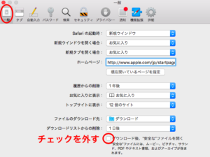 safariを起動した状態で画面上の「Safari > 環境設定 > 一般 」を開き、一般の画面下にある「ダウンロード後、"安全な"ファイルを開く」のチェックを外します。