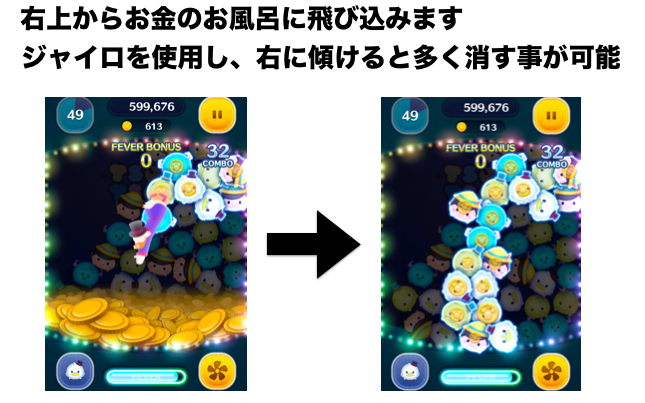 ジャイロを使用してツムを右に偏らせることでスキルによる消去数を増やす事ができます。