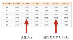 ※表のSL()のカッコ内は1チェーン増えるごとの増加量です。